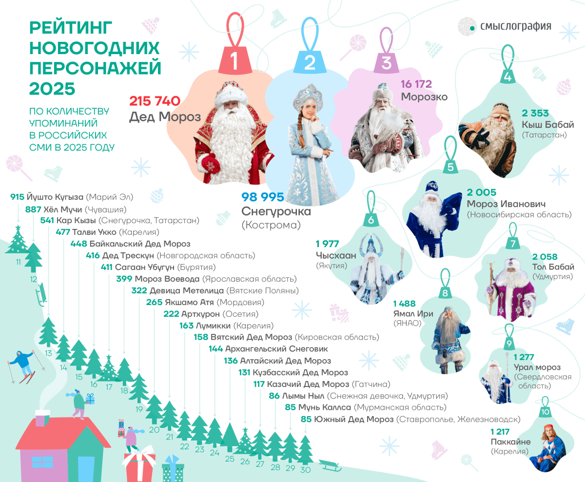 В 2025 году «королём» медийного пространства стал Дед Мороз (215,7 тыс. упоминаний, на 11% больше, чем год назад). Снегурочка из Костромы (98,9 тыс. упоминаний, 9% роста по сравнению с 2024 годом) — главный женский образ, который давно стал частью национальной сказки, как обычно — на втором месте рейтинга.